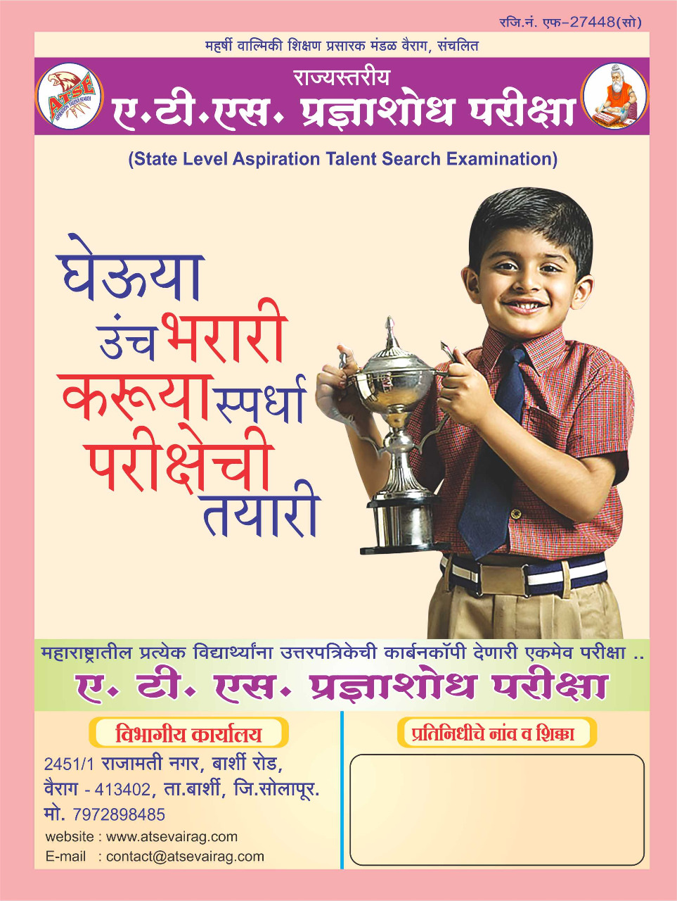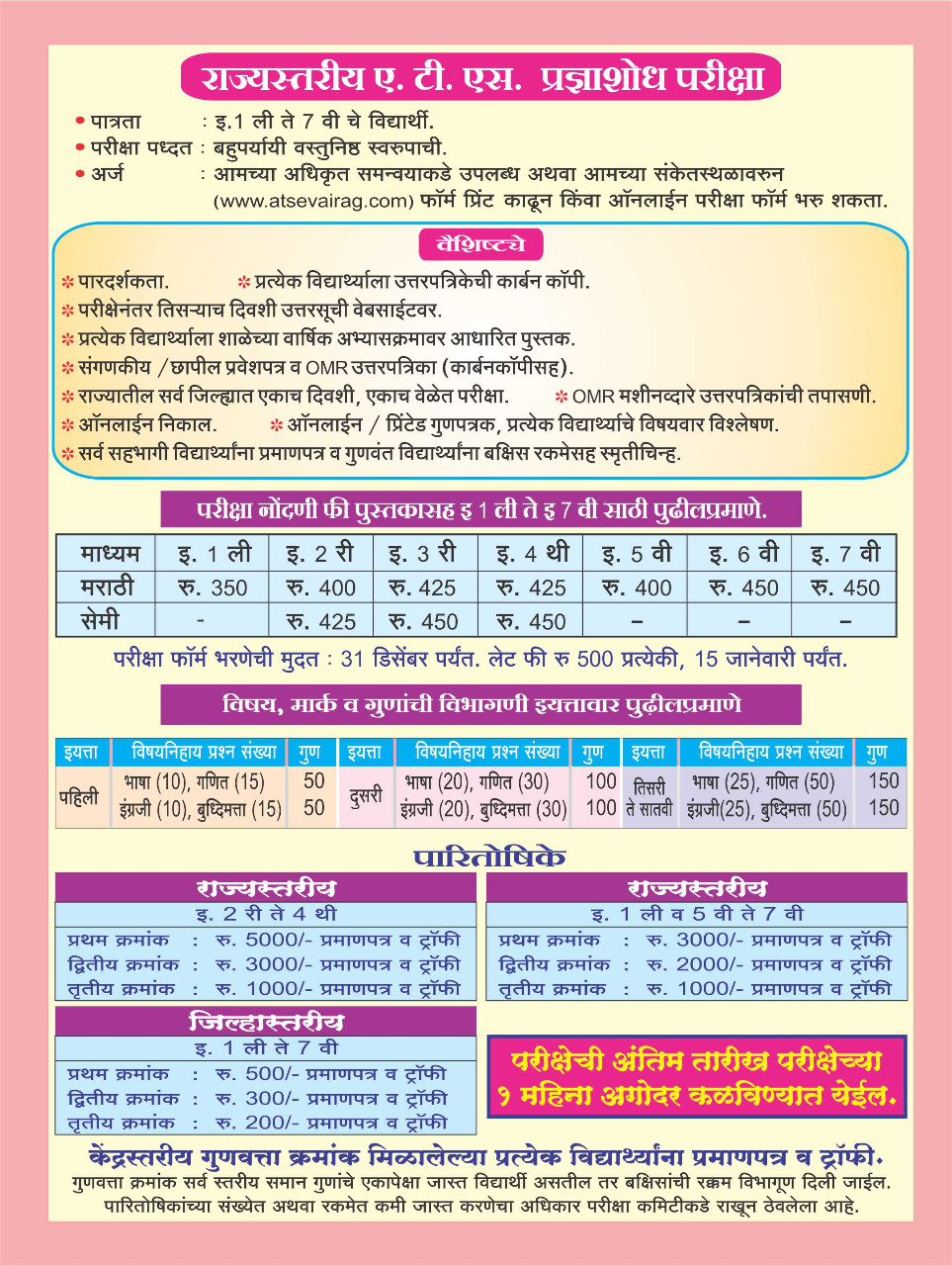 * * सूचना :- * राज्यस्तरीय ए.टी.एस. प्रज्ञाशोध परीक्षा' सत्र 2025/26 मधील परीक्षा दिनांक 22 मार्च 2026 घेण्यात आली होतो त्याची उत्तरसूची वर्ष निवडून पाहू शकता, संबधित माहितीची शिक्षकांनी व पालकांनी याची नोंद घ्यावी ही नम्र विनंती.